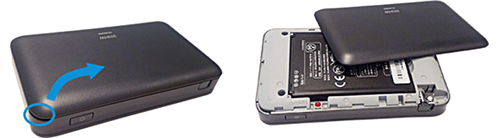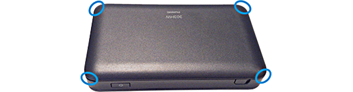 電池カバーの向きを確認して本体に載せ、四隅の○の部分をしっかりと押してはめ込み、電池カバー全体に浮きがないことを確認します。