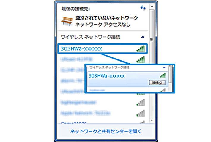 Windowsより同じネットワーク名(SSID)をクリックすると、ネットワーク名より下が展開されるので[接続]をクリックしてください。