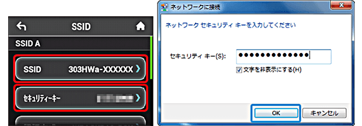 端末に表示させたセキュリティキーをWindowsのセキュリティキー欄に入力し、「OK」をクリックします。