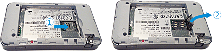 USIMカードストッパーを①の方向へ倒し、②の矢印の方向へスライドさせます。