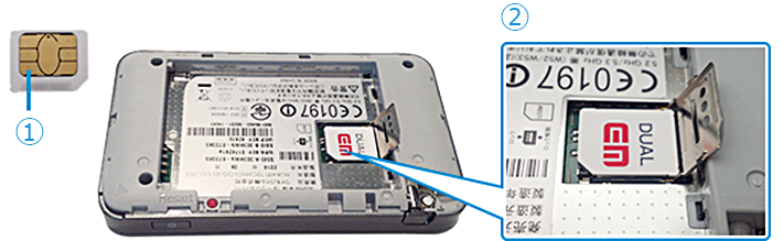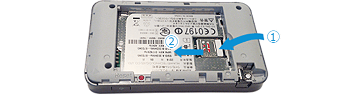 USIMカードの金属部分(①)を下にして、②のような向きで、USIMカードスロットに置きます。