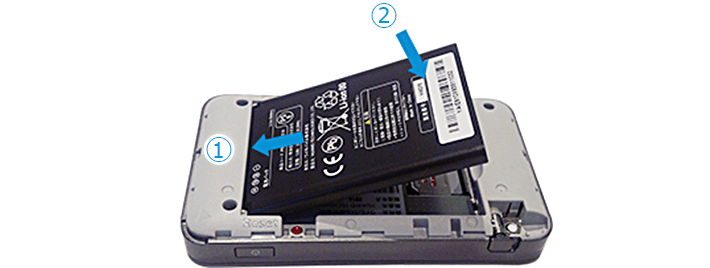 電池パックの端子部分(金属)を本体の端子部分に合わせて①の方向に押し付け、②の方向にしっかりと押し込みます。