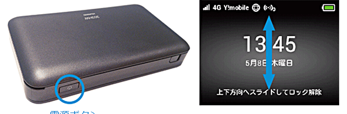 ○印の電源ボタンを2秒以上長押して電源をONにすると、しばらくしてディスプレイに「画面ロック」画面が表示されますので、画面を上下のどちらかにスライドしてロックを解除してください。