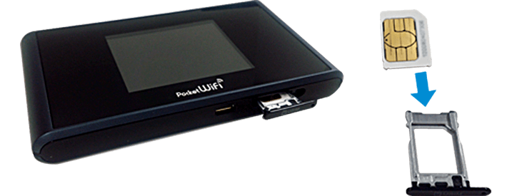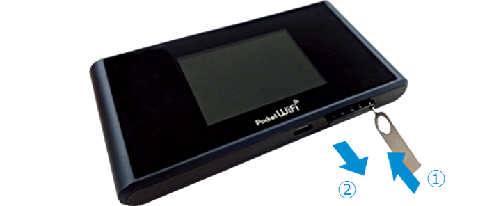 USIMカードを①のようにIC(金属)部分を上にし、USIMカードトレイに取り付け、USIMカードトレイを ②の方向にゆっくりと奥まで押して取り付けます。