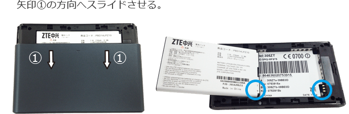 電池カバーを取り外します。カバーの端を指で押して、①の方向にスライドし、上の方へ持ち上げるように取り外します。電池パックの(+)(-)が表示されている面を上にして、端子部分を本体の端子部分に合わせて しっかりと中に押し込みます。電池カバーを再び、装着してください。
