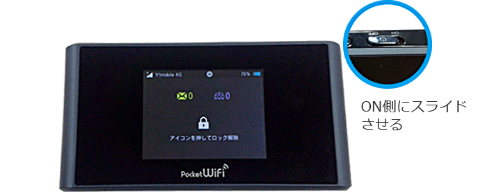 電源スイッチをON側にスライドします。初期画面のロックアイコンをタップしてください。 ロックが解除され、ホーム画面が表示されます。