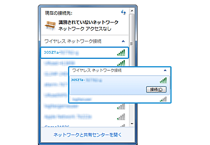 「スタート(Windowsのロゴボタン) - 「コントロールパネル」 - 「ネットワークとインターネット」 - 「ネットワークと共有センター」 - 「ネットワークに接続」をクリックする方法もあります。