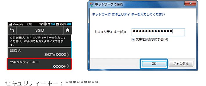 端末に表示させたセキュリティキーをWindowsのセキュリティキー欄に入力し、「OK」をクリックします。