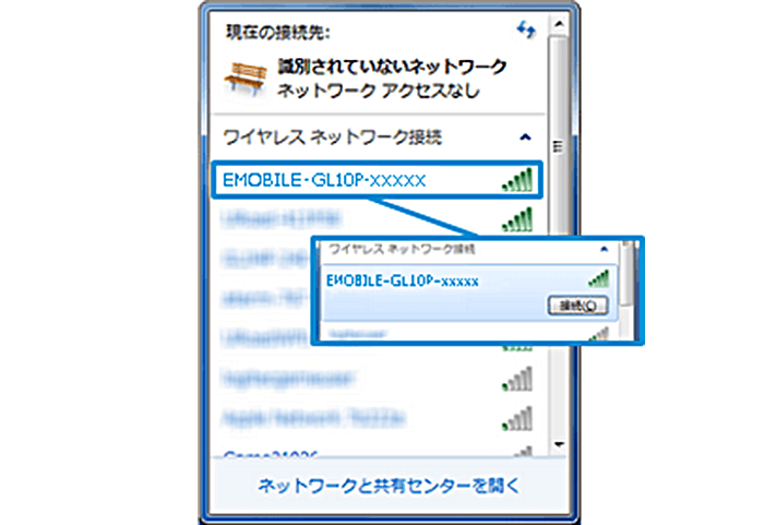 「スタート(Windowsのロゴボタン) - 「コントロールパネル」 - 「ネットワークとインターネット」 - 「ネットワークと共有センター」 - 「ネットワークに接続」をクリックする方法もあります。