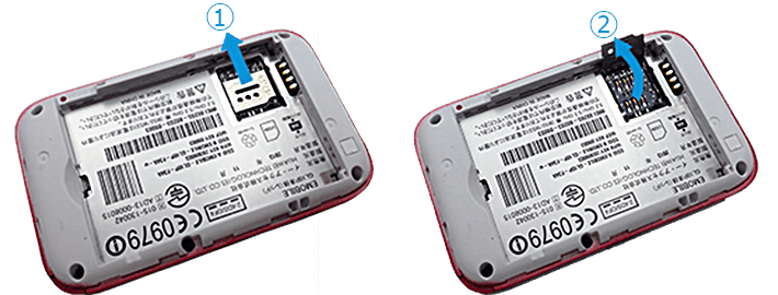 USIMカードストッパーを①の方向へスライドさせ、②の矢印の方向へ持ち上げます。