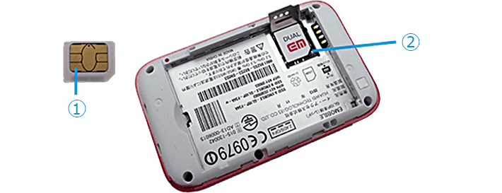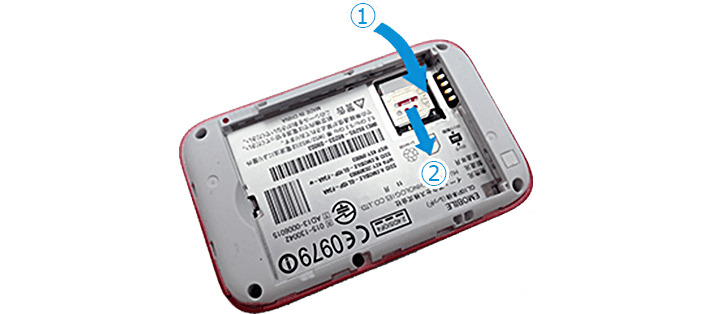 USIMカードの金属部分(①)を下にして、②のような向きで、USIMカードスロットに置きます。