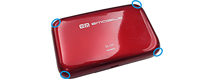 電池カバーの向きを確認して本体に載せ、四隅の○の部分をしっかりと押してはめ込み、電池カバー全体に浮きがないことを確認します。