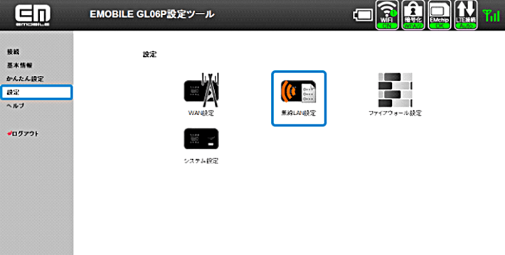 左のメニューより「設定」を選択し、「無線LAN設定」をクリックします。
