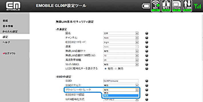 無線LAN基本/セキュリティ設定画面が表示されますので「プライバシーセパレータ」より「無効」を選択します。