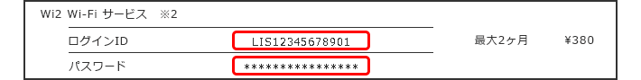 弊社からお届けしている「お申込内容のお知らせ」裏面にある「wi2 Wi-Fi サービス」欄のログインID、パスワードで「wi2 Connect」にログインしてください。